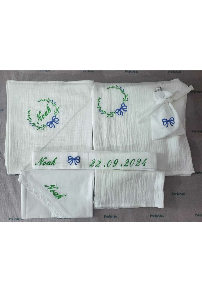La trusoul personalizat se va broda numele pe prosop, numele pe panza de mir si numele si data pe fasa de botez. Daca clientul doreste si alte personalizari suplimentare de text sau imagini acestea se achita separat.