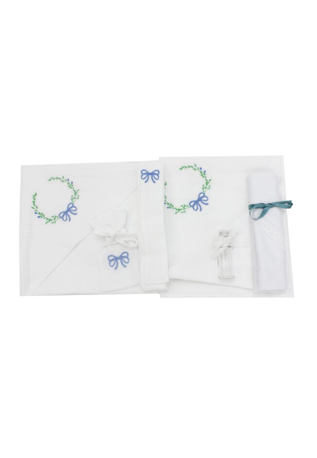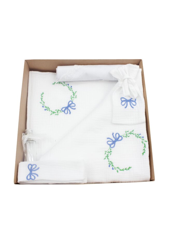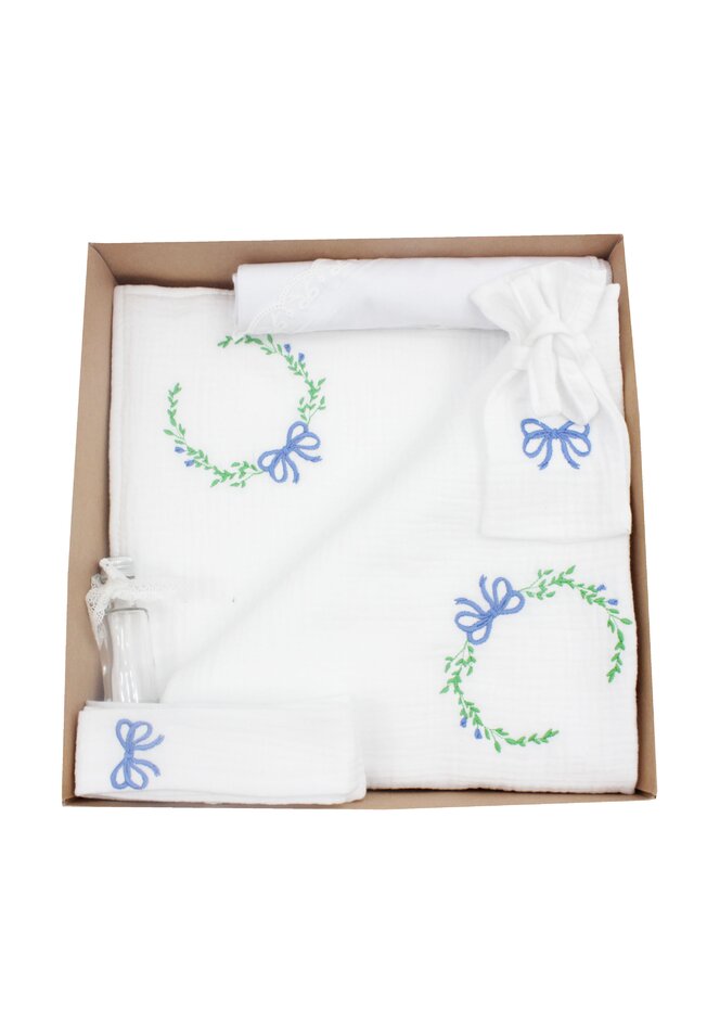 Trusou botez din muselina, alb, 7 piese, brodat, fundita albastra