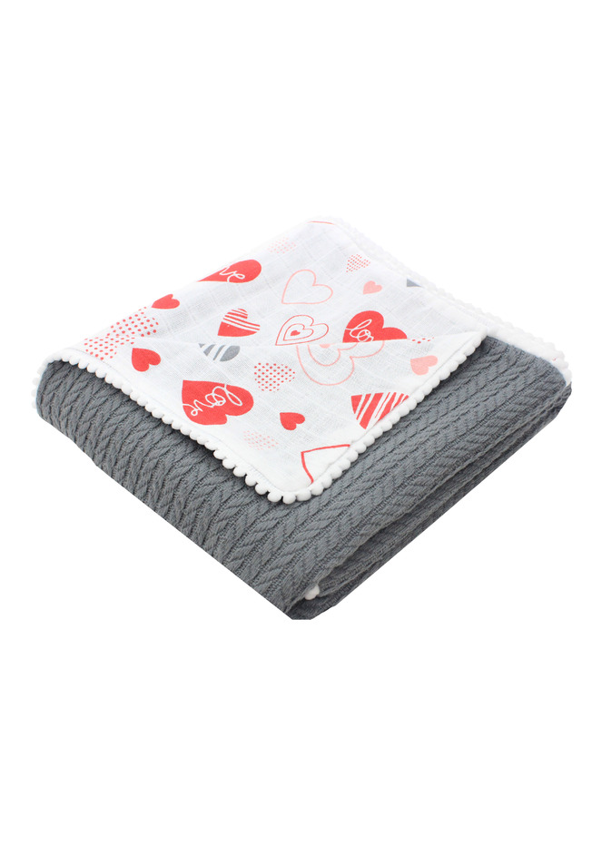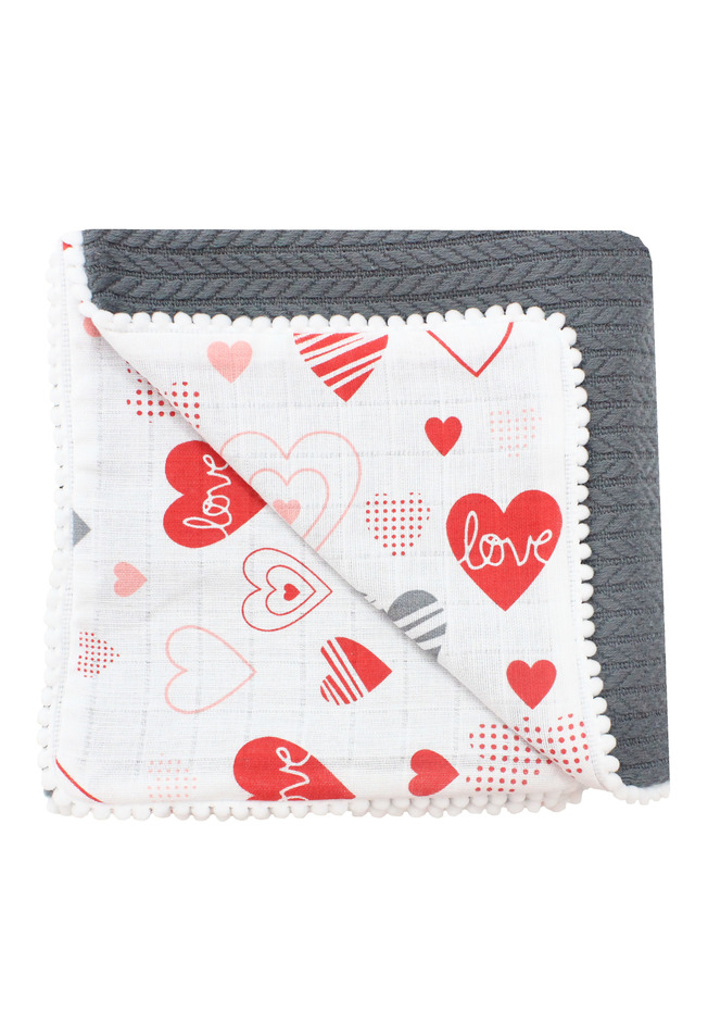 Paturica tricotata, Anna gri inchis, verso muselina, inimioare Love, cu ciucuri, 100x80 cm