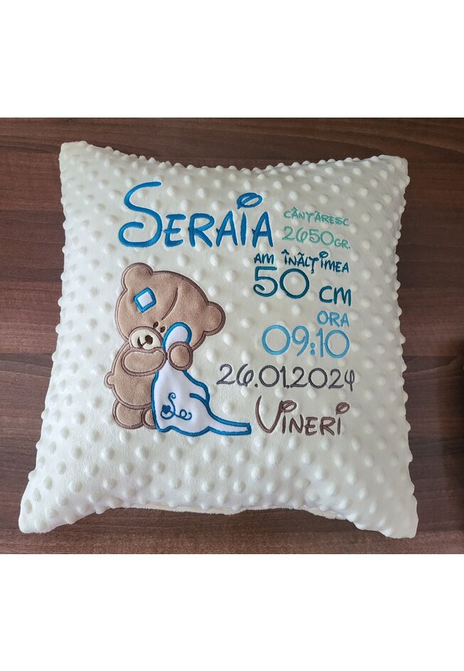 Personalizata cu datele nasterii micutului dumneavostra, aceasta perna va ramane o amintire pretioasa atat pentru mamica, cat si pentru copil.