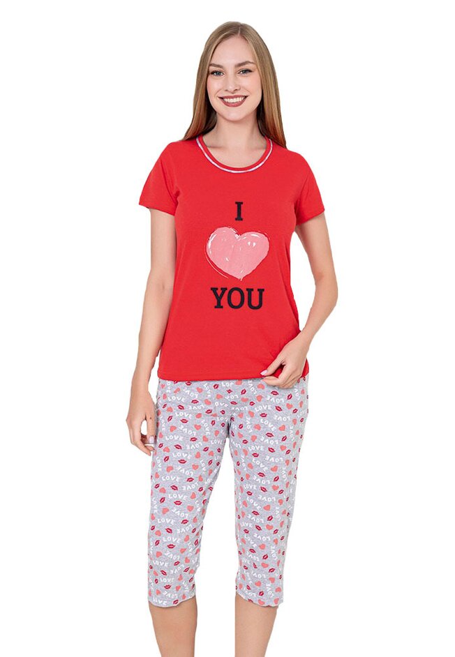 Pijama femei, pantalon 3/4, bumbac, I love you, rosu cu gri