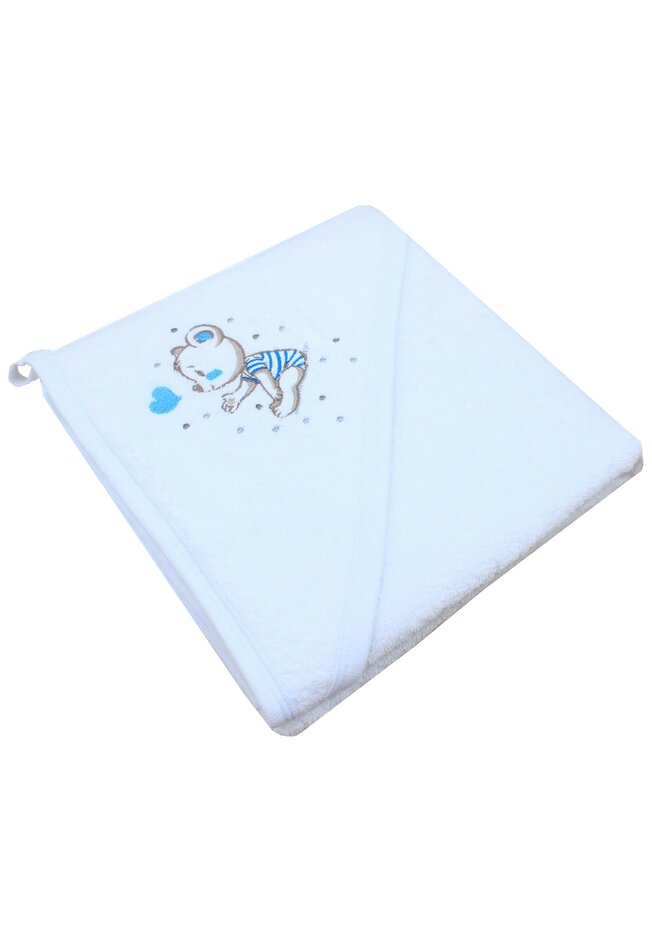 Prosop cu gluga, Ursulet cu inimioara albastra, bumbac, alb, 80 x 100 cm