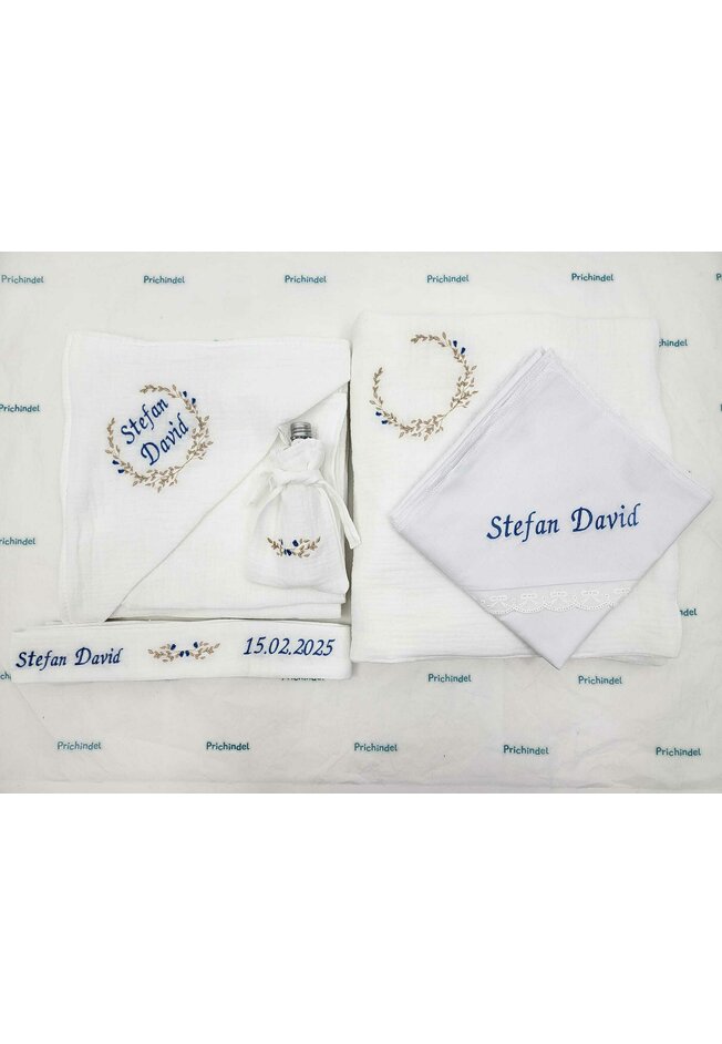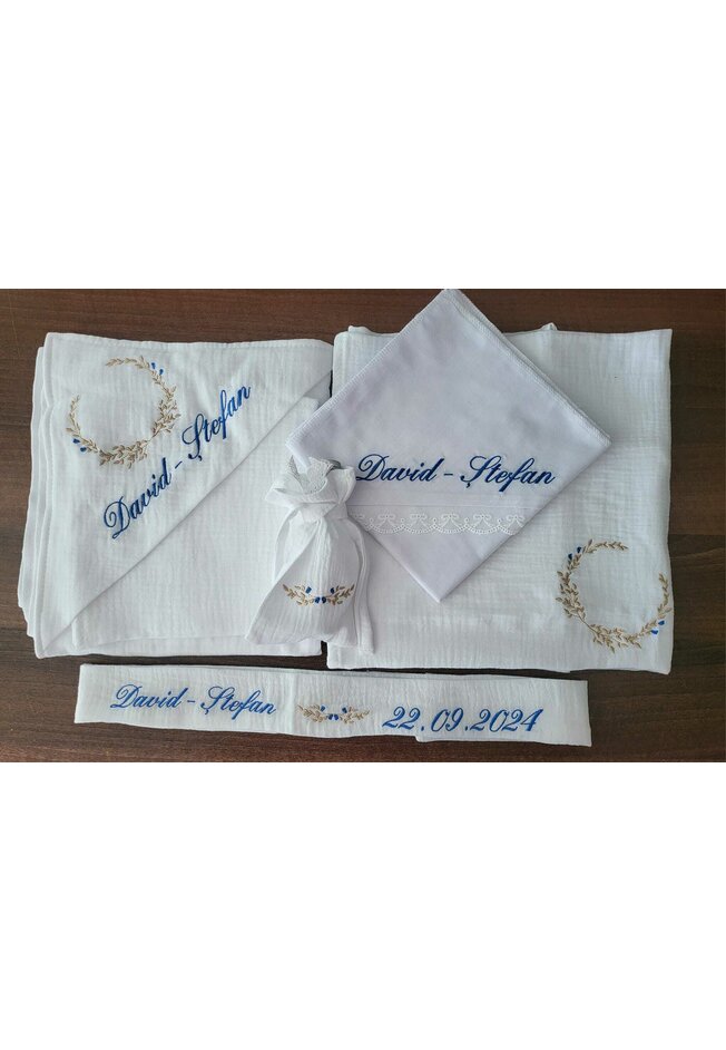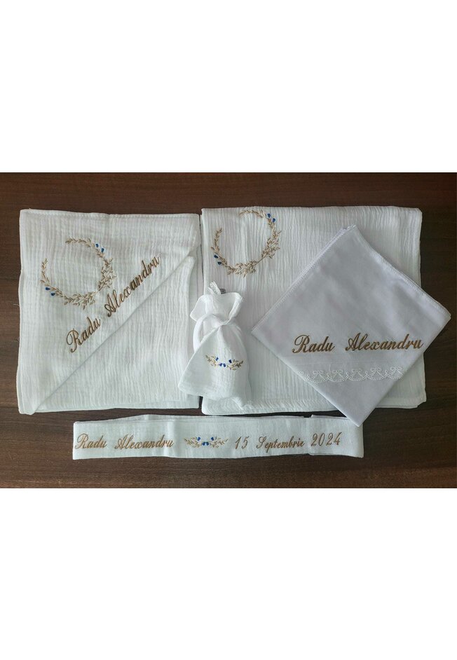 La trusoul personalizat se va broda numele pe prosop, numele pe panza de mir si numele si data pe fasa de botez. Daca clientul doreste si alte personalizari suplimentare de text sau imagini acestea se achita separat.
