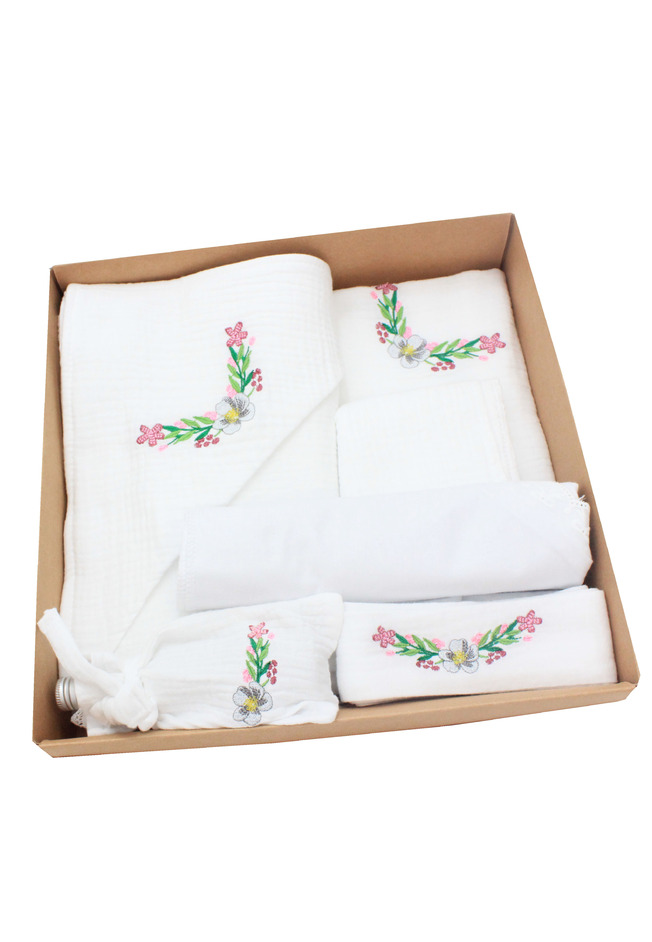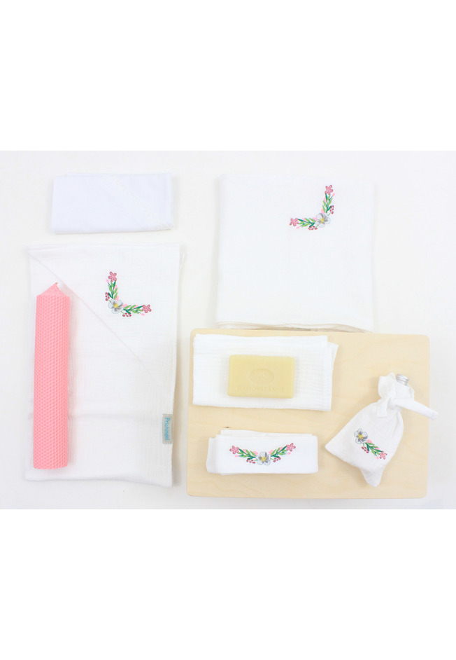Trusou botez din muselina, 7 piese, brodat, Lorelay, alb cu floricele