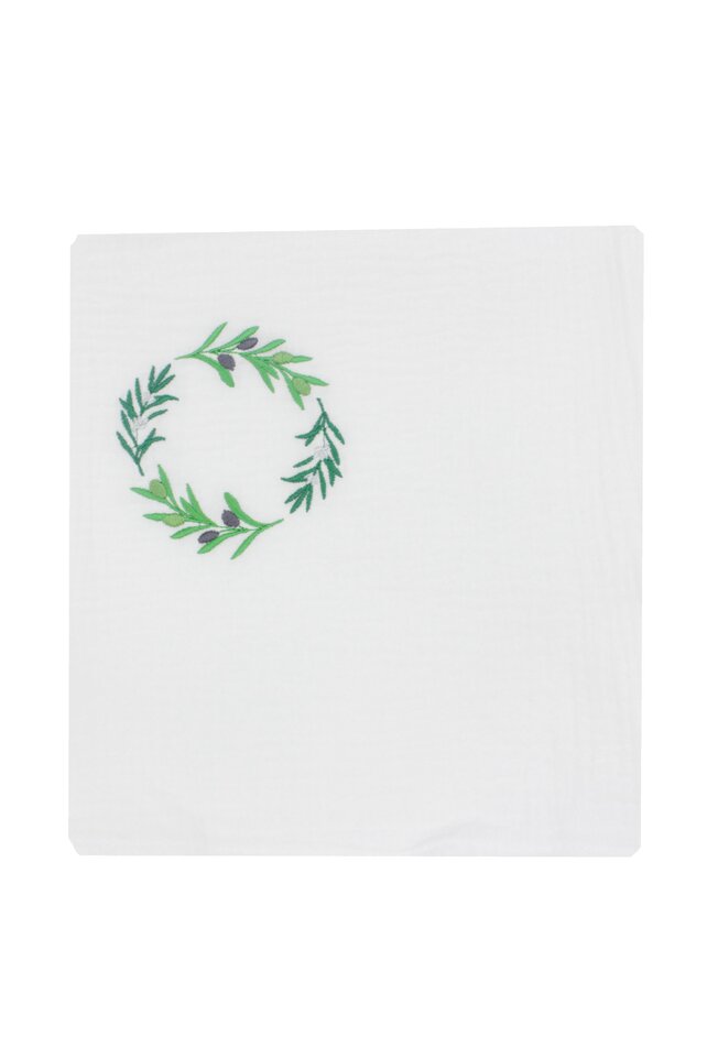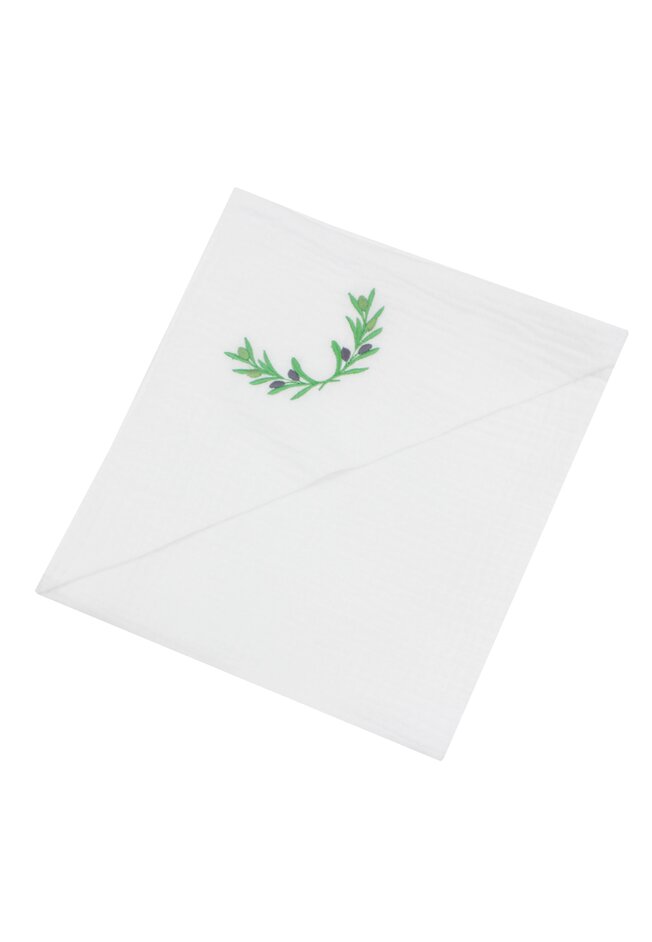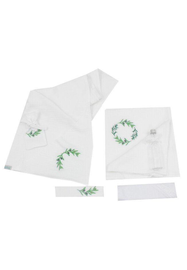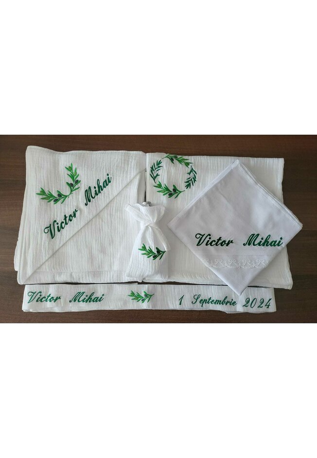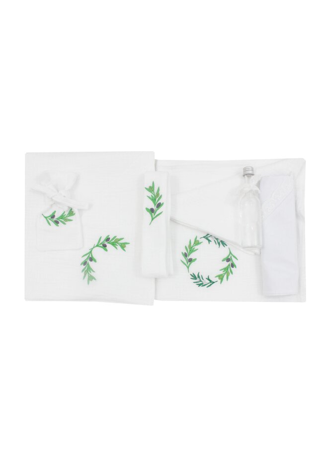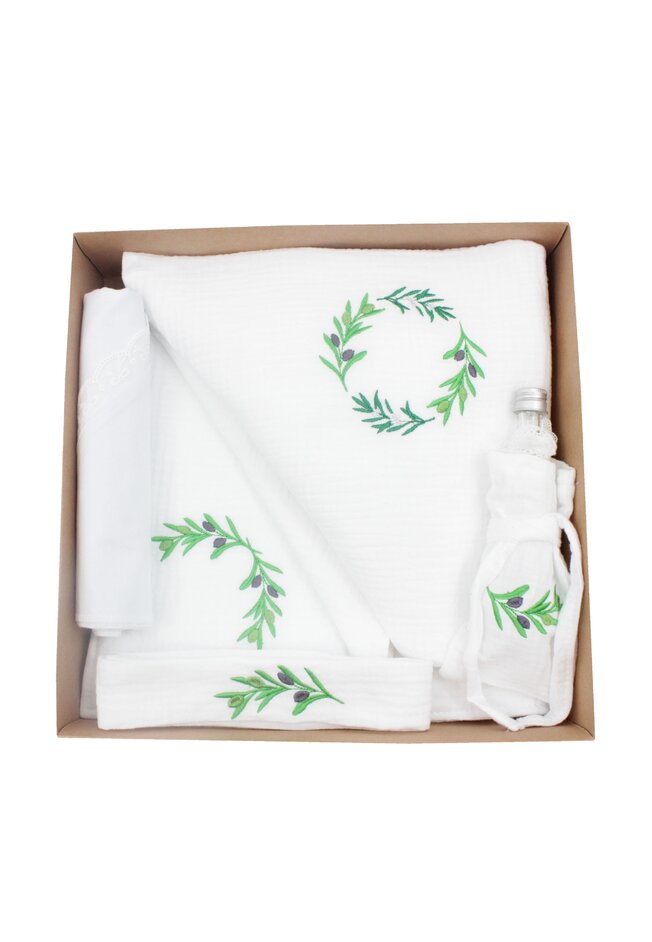 Trusou botez din muselina, 7 piese, frunze de maslin, alb