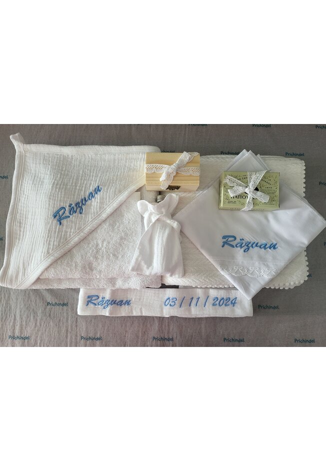 La trusoul personalizat se va broda numele pe prosop, numele pe panza de mir si numele si data pe fasa de botez. Daca clientul doreste si alte personalizari suplimentare de text sau imagini acestea se achita separat.